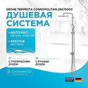 Устройство: душевая система • Смеситель: джойстик • Ручной душ (душевая лейка): размер 100 мм, настройки 2 шт • Верхний душ (тропический): размер 250 мм, настройки 1 шт • Комплектация: ручной душ, верхний душ, смеситель, стойка, шланг, крепление ручного душа